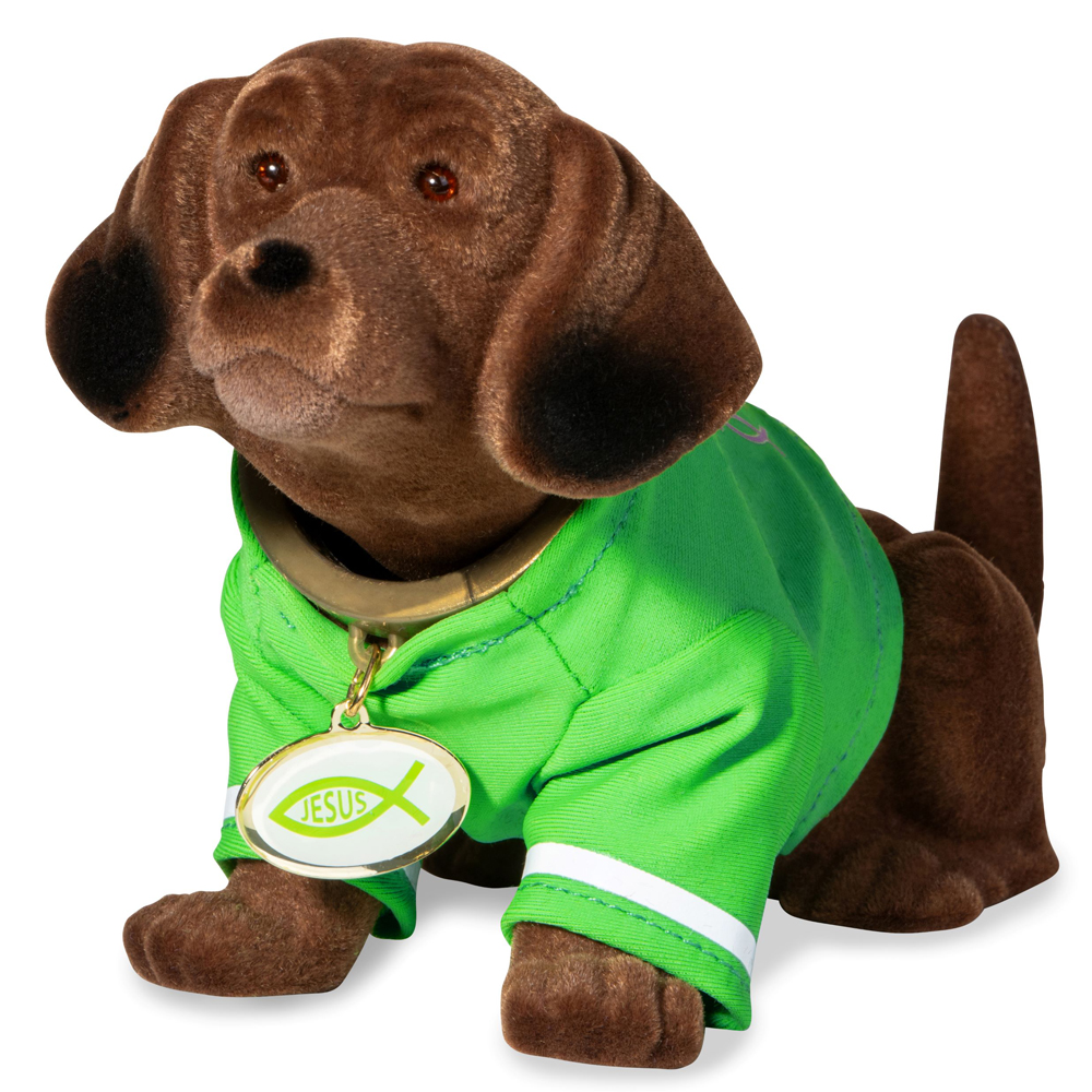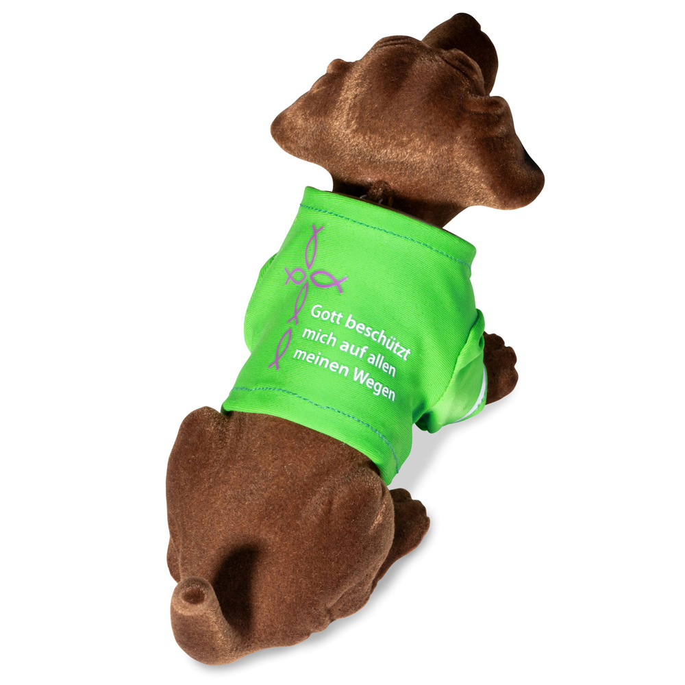Original Wackeldackel in farbenfrohem Dress mit Aufschrift "Gott beschützt mich auf allen meinen Wegen" und Ichthys-Anhänger aus Messing mit Inschrift "Jesus".